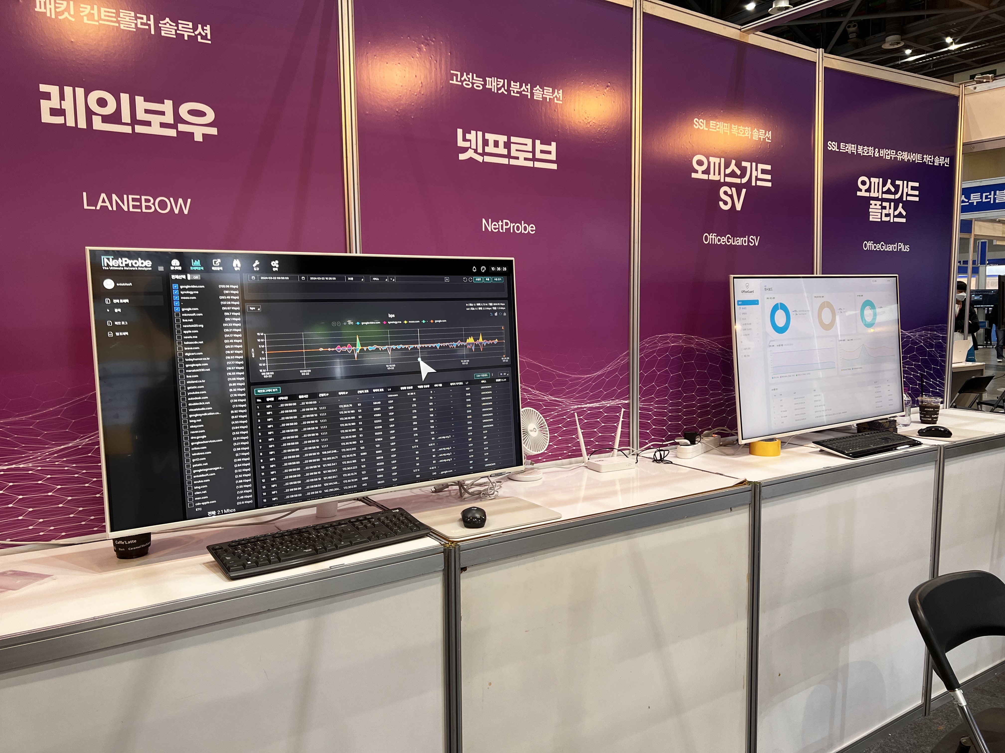 이날 소개된 솔루션으로는, OfficeGuard SV(SSL 트래픽 복호화 및 비업무 유해사이트 차단), LANEBOW(패킷 컨트롤러), NetProbe(고성능 패킷 분석) 등을 소개했습니다.