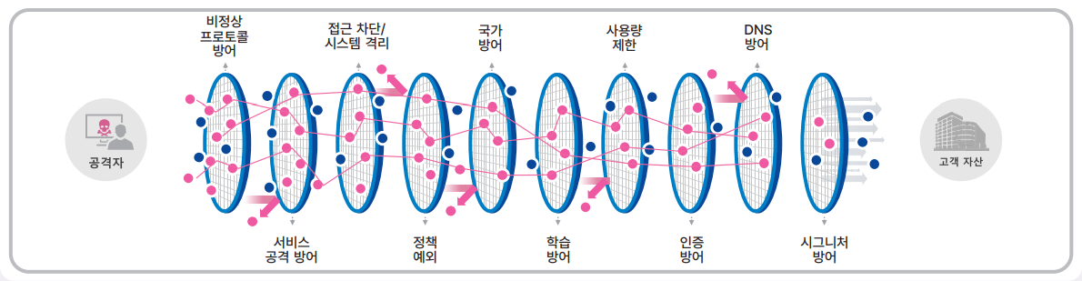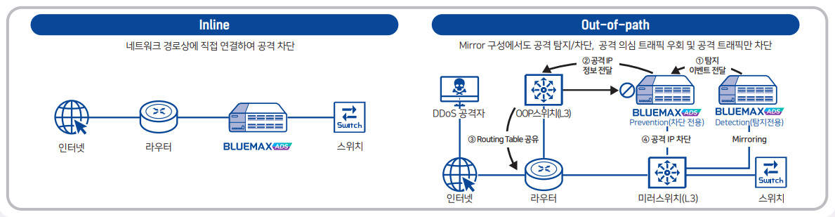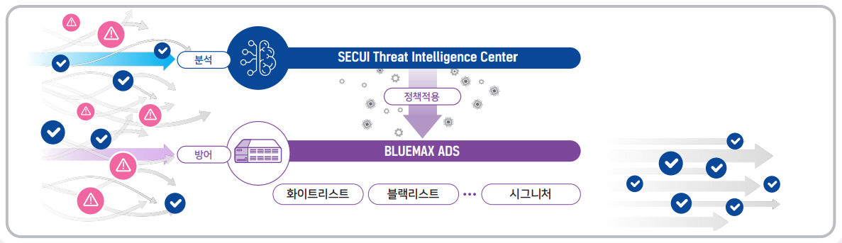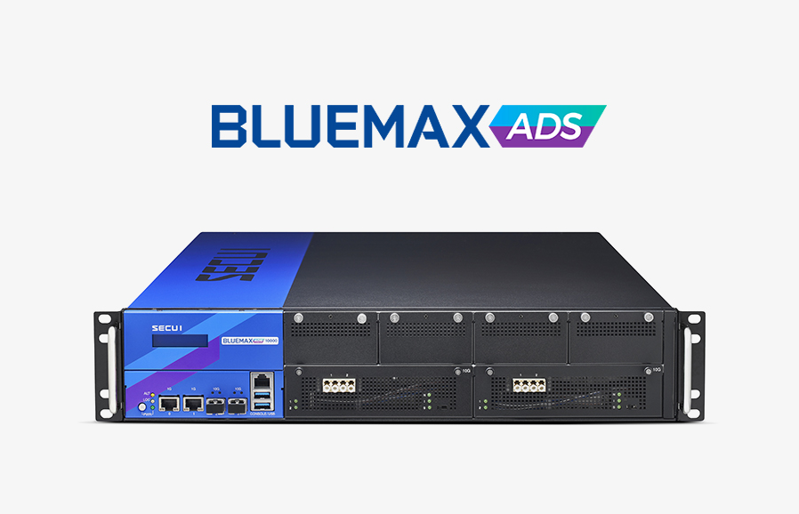 인증 기반 방어 높은 신뢰성을 보장하는 TCP, UDP, HTTP, DNS 인증 방어 기능으로 대용량 트래픽 DDoS 공격에도 서비스 연속성 보장 서비스 거부 방어 신속하고 정확하게 DoS, DDoS, DRDoS 등 다양한 유형의 DDoS 공격을 탐지하여 효과적으로 대응 학습 기반 방어 자동으로 패턴 및 트래픽을 학습하고 학습 데이터 기반으로 관리자에게 보안 설정을 권고하는 스마트한 DDoS 방어 체계 DNS 방어 악의적이거나 금지된 웹 사이트 등의 효율적인 탐지와 신속한 차단으로 DNS 보안 위협에 빠르게 대응 Open API BLUEMAX ADS의 우수한 기능을 손쉽게 연동하는 Open API 제공, 종속성 없는 3rd party 연동 지원 Analytics 사용자 중심의 인터페이스 및 위젯 제공으로 DDoS 공격 대응에 특화 된 직관적인 분석 환경 제공 원클릭 분석 서비스 마우스 클릭 한번으로 시큐아이 침해대응센터로 탐지 이벤트를 전송하여 신속하고 정확한 이벤트 분석 결과를 회 Out-Of-Path 공격 트래픽만을 자동으로 우회시켜 차단하기 때문에 다른 네트워크 장비나 서비스에 영향을 최소화, DDoS 공격을 효과적으로 방어
