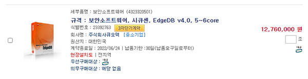 NOTICE >공지사항 >업계소식 >뉴스레터 >프로모션 >RECRUIT - 공지사항 업계소식 뉴스레터 Vol.23 Vol.22 Vol.21 Vol.20 Vol.19 Vol.18 Vol.17 Vol.16 Vol.15 프로모션 고객 프로모션 파트너 프로모션 RECRUIT 문의 전화 02.3663.3212 Daily:09:00~18:00 Lunch:12:00~13:00 공지사항 Home > NOTICE [나라장터] EdgeDB v4.0 2018-06-25 11:59:32 관리자 EdgeDB는 국가정보원 암호모듈인증과 GS인증을 획득한 제품으로 중요 정보를가지고 있는 DBMS 내의 데이터를 암호화하여 저장하는 DB암호화 솔루션 입니다.<아래의 품목들을 각각 클릭하시면 나라장터 종합쇼핑몰로 바로 이동이 가능합니다.> < 이전 다음 > 목록