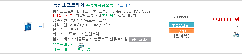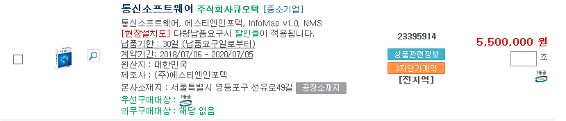 NOTICE >공지사항 >업계소식 >뉴스레터 >프로모션 >RECRUIT - 공지사항 업계소식 뉴스레터 Vol.23 Vol.22 Vol.21 Vol.20 Vol.19 Vol.18 Vol.17 Vol.16 Vol.15 프로모션 고객 프로모션 파트너 프로모션 RECRUIT 문의 전화 02.3663.3212 Daily:09:00~18:00 Lunch:12:00~13:00 공지사항 Home > NOTICE [나라장터] InfoMap v1.0 2018-07-09 18:08:34 관리자 InfoMap은 GS인증을 획득한 제품으로 전송, 네트워크, 서버, 시설물 장비에 대한 통합관제 및 종합상황판을 지원하며 성능 및 장애, 장애 알람을 통해 실시간 모니터링 기능을 제공합니다.<아래의 품목들을 각각 클릭하시면 나라장터 종합쇼핑몰로 바로 이동이 가능합니다.> < 이전 다음 > 목록