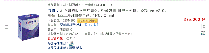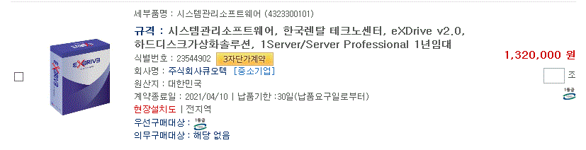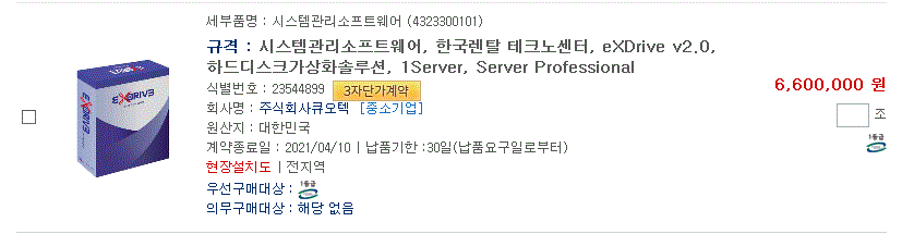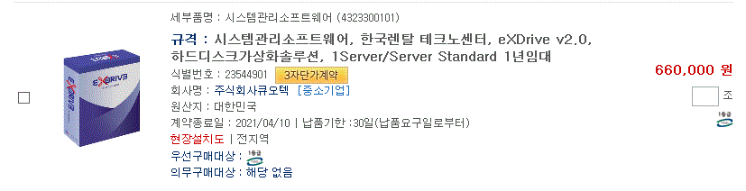 NOTICE >공지사항 >업계소식 >뉴스레터 >프로모션 >RECRUIT - 공지사항 업계소식 뉴스레터 Vol.23 Vol.22 Vol.21 Vol.20 Vol.19 Vol.18 Vol.17 Vol.16 Vol.15 프로모션 고객 프로모션 파트너 프로모션 RECRUIT 문의 전화 02.3663.3212 Daily:09:00~18:00 Lunch:12:00~13:00 공지사항 Home > NOTICE [나라장터] eXDrive v2.0 2019-04-17 16:54:35 관리자 eXDrive v2.0 은 GS인증을 획득한 제품으로 PC의 OS 및 응용프로그램을 중앙서버(eXDrive) 스토리지에 구성하여 사용자 PC의 하드디스크를 제거하고, 중앙서버의 마스터 이미지를 통해 PC를 구동 시키는 디스크 가상화 솔루션 입니다.<아래의 품목들을 각각 클릭하시면 나라장터 종합쇼핑몰로 바로 이동이 가능합니다. < 이전 다음 > 목록