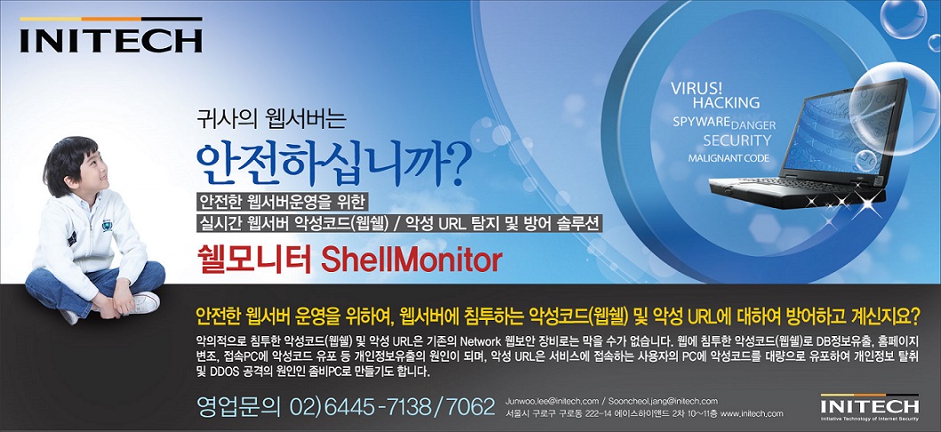 NOTICE >공지사항 >업계소식 >뉴스레터 >프로모션 >RECRUIT - 공지사항 업계소식 뉴스레터 Vol.23 Vol.22 Vol.21 Vol.20 Vol.19 Vol.18 Vol.17 Vol.16 Vol.15 프로모션 고객 프로모션 파트너 프로모션 RECRUIT 문의 전화 02.3663.3212 Daily:09:00~18:00 Lunch:12:00~13:00 업계소식 Home > NOTICE 웹쉘탐지 및 방어 GS 및 CC 최초인증획득! 웹보안 솔루션 ShellMonitor 2013-05-13 12:26:02 관리자 < 이전 다음 > 목록