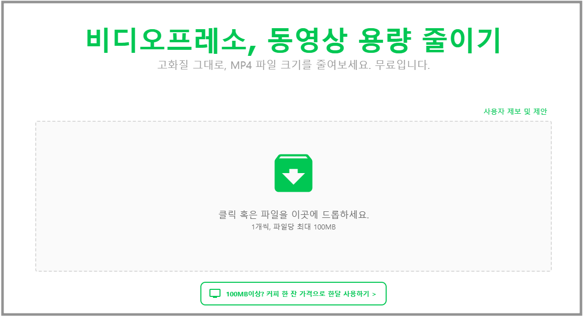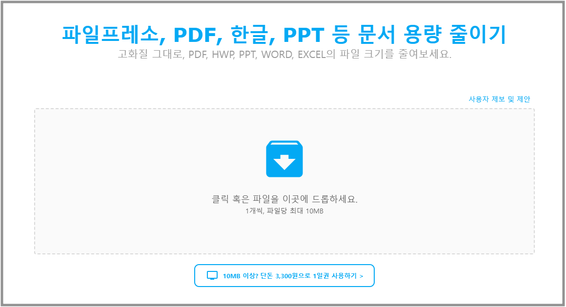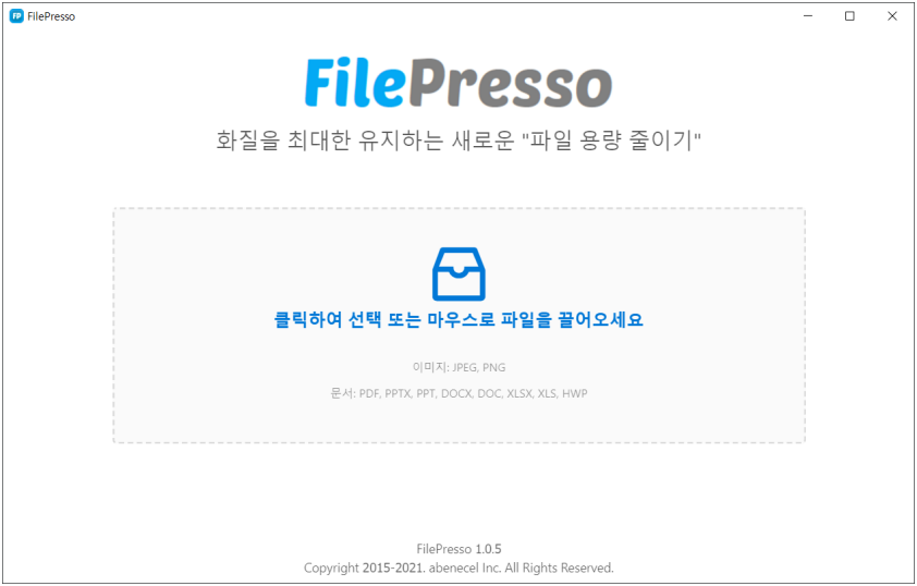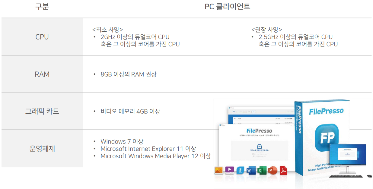 문서 최적화 솔루션 파일프레소(문서)의 경우 PDF / HWP / PPT / WORD / EXCEL 등 문서 파일의 확장자를 유지하며 용량만을 최적화합니다. 이미지 최적화 솔루션 파일프레소(이미지)의 경우 JPG / JPEG / PNG 등 이미지 파일의 확장자를 유지하며 용량만을 최적화합니다. 비디오 최적화 솔루션 파일프레소(비디오)의 경우 AVI / MP4 / MOV / MPEG 등 비디오 파일의 확장자를 유지하며 용량만을 최적화합니다.