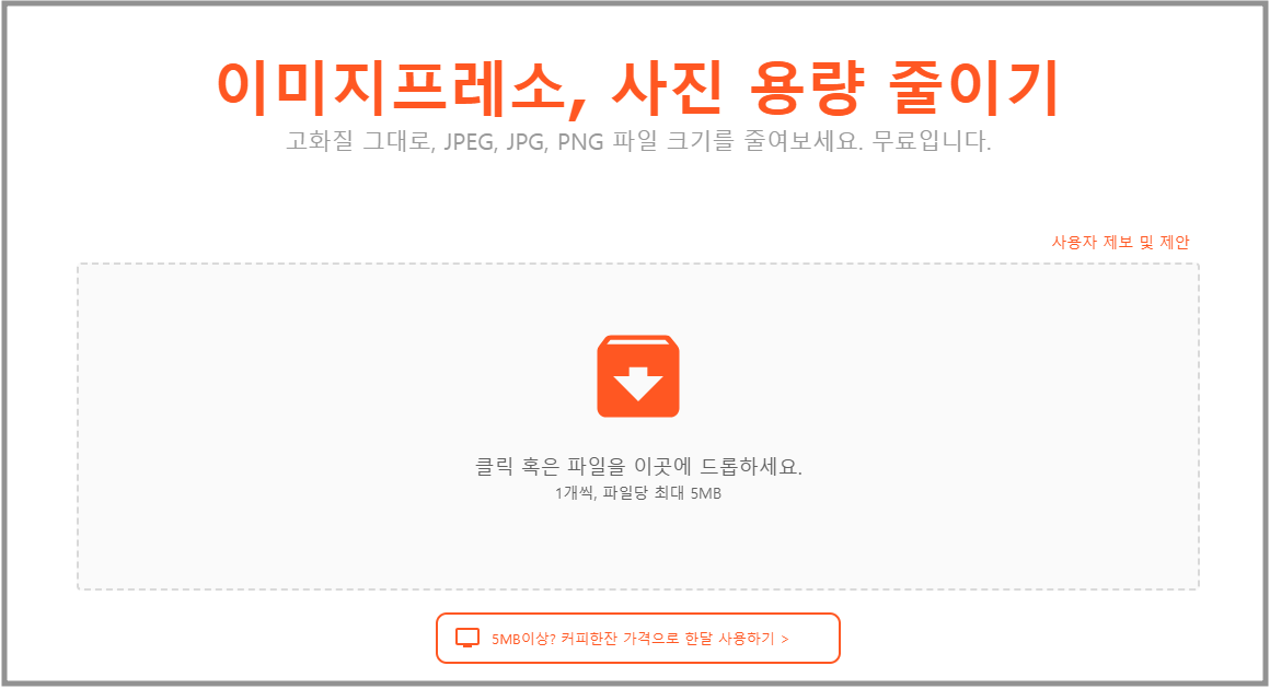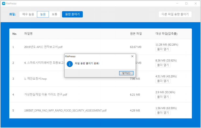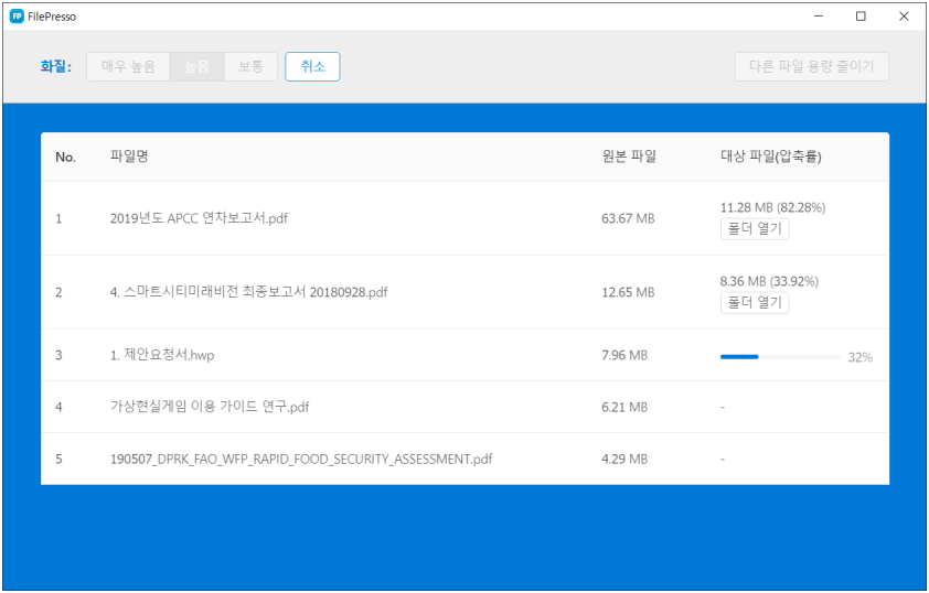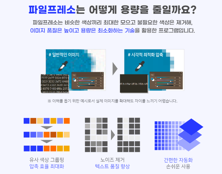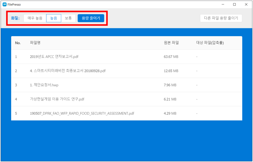 1. 최적화 파일 선택 파일프레소 프로그램 실행 후 중앙 박스를 클릭하여 파일을 선택하거나, 파일을 드래그하여 박스안에 드롭하는 방식으로 최적화를 진행할 파일을 선택할 수 있습니다. 2. 화질 옵션 선택 최적화할 파일의 품질을 선택할 수 있습니다. 이미지의 품질을 '매우높음/높음/보통' 단위로 선택하여 용량을 줄일 수 있으며 가능한 최소 용량으로 파일이 최적화 됩니다. 3. 최적화 진행 파일 선택을 완료한 뒤 [용량 줄이기] 버튼을 눌러 최적화 진행을 합니다. 등록한 순서대로 진행되며 원본파일의 용량과 최적화된 용량, 압축률까지 확인할 수 있습니다. 4. 최적화 완료 최적화 소요 시간은 원본 파일의 크기와 FilePresso가 설치된 PC의 성능에 따라 차이가 있을 수 있으며, 해상도가 너무 낮은 이미지의 경우 재 최적화가 불가능합니다.