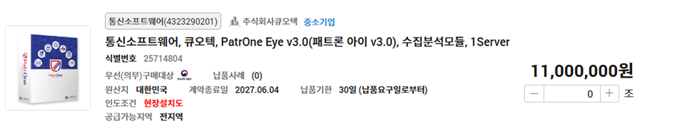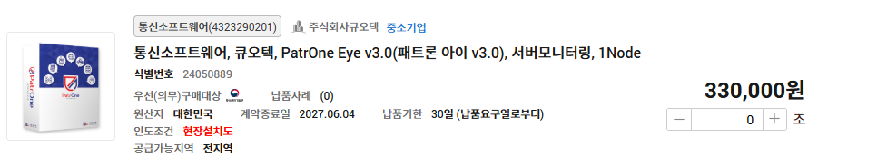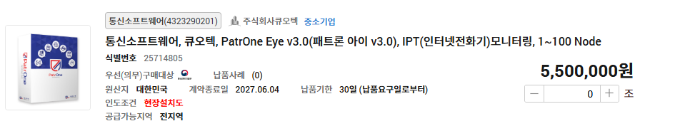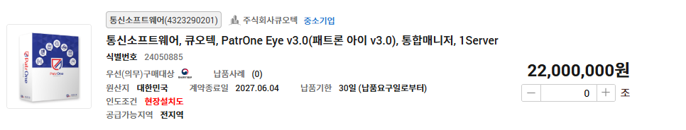 G2BSHOP 나라장터 종합쇼핑몰 >Maestro >PatrOne Eye >PatrOne Copy >PCGuard >nBlock >OfficeGuard SV >EdgeDB >I-Stamp Maestro PatrOne Eye PatrOne Copy PCGuard nBlock OfficeGuard SV EdgeDB I-Stamp 문의 전화 02.3663.3212 Daily:09:00~18:00 Lunch:12:00~13:00 PatrOne Eye Home > G2BSHOP PatrOne Eye v3.0(패트론 아이 v3.0)은 GS인증(1등급)을 획득한 제품으로 다양한 IT관리 자원을하나의 시스템에서 “통합 모니터링 하는 시스템” 입니다. PatrOne Eye v3.0은 보다 직관적이고 유연한 종합 상황판을 제공하여 장애 발생 및 성능 장애에 즉각 대응합니다. <아래의 품목을 각각 클릭하시면 조달청 디지털서비스몰로 바로 이동합니다.>