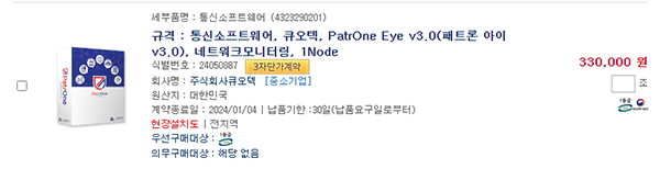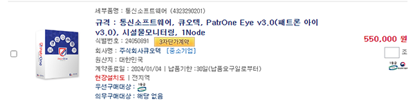 NOTICE >공지사항 >업계소식 >뉴스레터 >프로모션 >RECRUIT - 공지사항 업계소식 뉴스레터 Vol.23 Vol.22 Vol.21 Vol.20 Vol.19 Vol.18 Vol.17 Vol.16 Vol.15 프로모션 고객 프로모션 파트너 프로모션 RECRUIT 문의 전화 02.3663.3212 Daily:09:00~18:00 Lunch:12:00~13:00 공지사항 Home > NOTICE [나라장터] PatrOne Eye v3.0 2021-01-05 18:45:12 관리자 PatrOne Eye v3.0은 GS인증 1등급을 획득한 제품으로 네트워크 장비, 서버, 시설물 및 IoT 장비의현황 및 장애 정보를 종합적으로 수집하여 관리하는 통합 모니터링 솔루션 입니다.<아래의 품목들을 각각 클릭하시면 나라장터 종합쇼핑몰로 바로 이동이 가능합니다.> < 이전 다음 > 목록