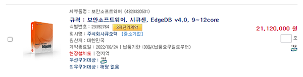 NOTICE >공지사항 >업계소식 >뉴스레터 >프로모션 >RECRUIT - 공지사항 업계소식 뉴스레터 Vol.23 Vol.22 Vol.21 Vol.20 Vol.19 Vol.18 Vol.17 Vol.16 Vol.15 프로모션 고객 프로모션 파트너 프로모션 RECRUIT 문의 전화 02.3663.3212 Daily:09:00~18:00 Lunch:12:00~13:00 공지사항 Home > NOTICE [나라장터] EdgeDB v4.0 2018-06-25 11:59:32 관리자 EdgeDB는 국가정보원 암호모듈인증과 GS인증을 획득한 제품으로 중요 정보를가지고 있는 DBMS 내의 데이터를 암호화하여 저장하는 DB암호화 솔루션 입니다.<아래의 품목들을 각각 클릭하시면 나라장터 종합쇼핑몰로 바로 이동이 가능합니다.> < 이전 다음 > 목록