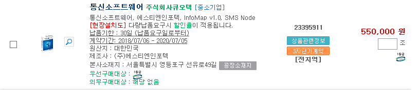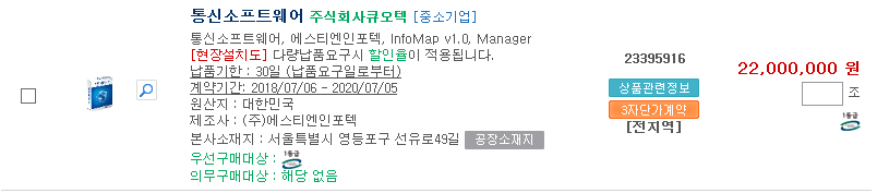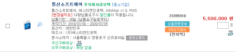 NOTICE >공지사항 >업계소식 >뉴스레터 >프로모션 >RECRUIT - 공지사항 업계소식 뉴스레터 Vol.23 Vol.22 Vol.21 Vol.20 Vol.19 Vol.18 Vol.17 Vol.16 Vol.15 프로모션 고객 프로모션 파트너 프로모션 RECRUIT 문의 전화 02.3663.3212 Daily:09:00~18:00 Lunch:12:00~13:00 공지사항 Home > NOTICE [나라장터] InfoMap v1.0 2018-07-09 18:08:34 관리자 InfoMap은 GS인증을 획득한 제품으로 전송, 네트워크, 서버, 시설물 장비에 대한 통합관제 및 종합상황판을 지원하며 성능 및 장애, 장애 알람을 통해 실시간 모니터링 기능을 제공합니다.<아래의 품목들을 각각 클릭하시면 나라장터 종합쇼핑몰로 바로 이동이 가능합니다.> < 이전 다음 > 목록
