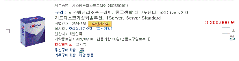 NOTICE >공지사항 >업계소식 >뉴스레터 >프로모션 >RECRUIT - 공지사항 업계소식 뉴스레터 Vol.23 Vol.22 Vol.21 Vol.20 Vol.19 Vol.18 Vol.17 Vol.16 Vol.15 프로모션 고객 프로모션 파트너 프로모션 RECRUIT 문의 전화 02.3663.3212 Daily:09:00~18:00 Lunch:12:00~13:00 공지사항 Home > NOTICE [나라장터] eXDrive v2.0 2019-04-17 16:54:35 관리자 eXDrive v2.0 은 GS인증을 획득한 제품으로 PC의 OS 및 응용프로그램을 중앙서버(eXDrive) 스토리지에 구성하여 사용자 PC의 하드디스크를 제거하고, 중앙서버의 마스터 이미지를 통해 PC를 구동 시키는 디스크 가상화 솔루션 입니다.<아래의 품목들을 각각 클릭하시면 나라장터 종합쇼핑몰로 바로 이동이 가능합니다. < 이전 다음 > 목록