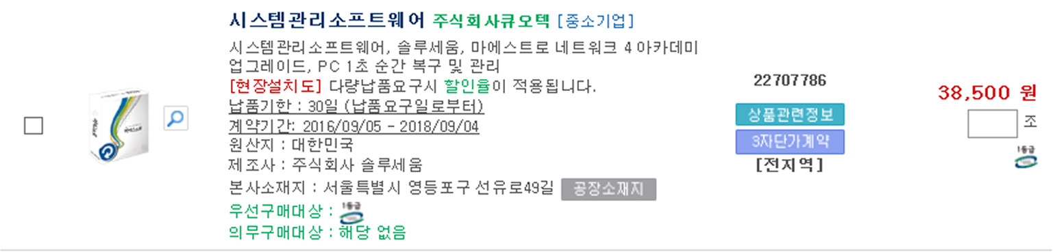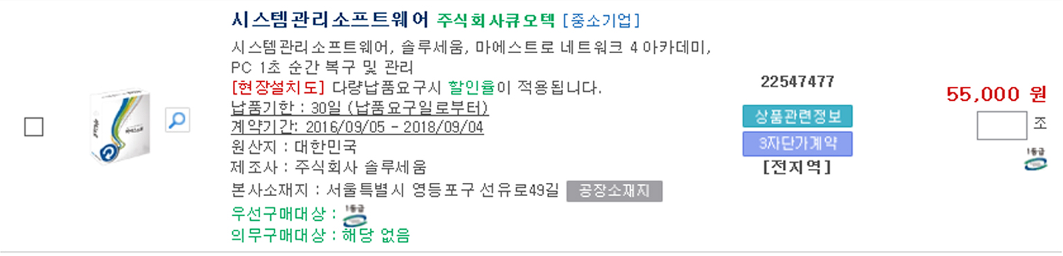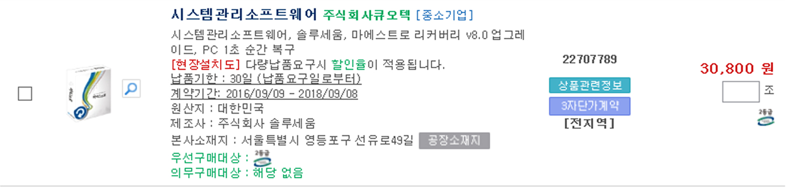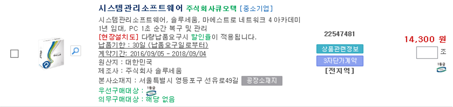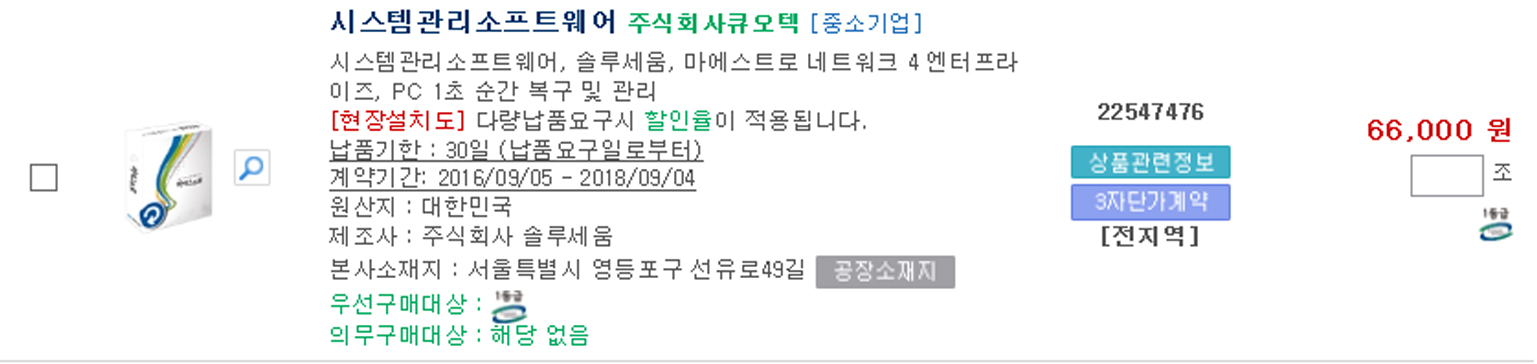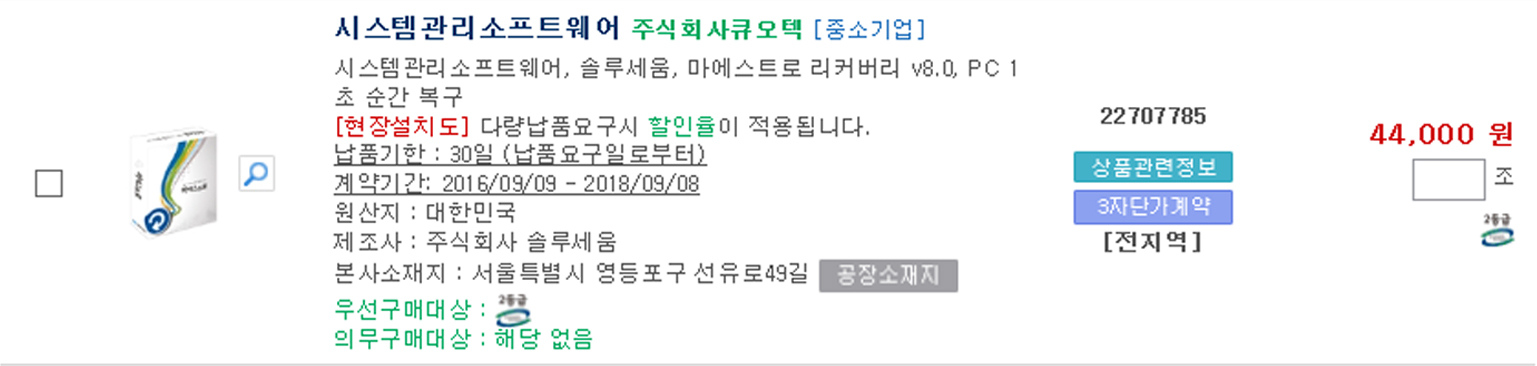 NOTICE >공지사항 >업계소식 >뉴스레터 >프로모션 >RECRUIT - 공지사항 업계소식 뉴스레터 Vol.23 Vol.22 Vol.21 Vol.20 Vol.19 Vol.18 Vol.17 Vol.16 Vol.15 프로모션 고객 프로모션 파트너 프로모션 RECRUIT 문의 전화 02.3663.3212 Daily:09:00~18:00 Lunch:12:00~13:00 공지사항 Home > NOTICE [나라장터] 마에스트로 2016-09-12 16:01:47 관리자 시스템 순간복구 및 관리 솔루션 마에스트로 제품입니다.아래의 품목을 클릭하시면 나라장터 종합쇼핑몰로 이동하여 바로 구매가 가능합니다. < 이전 다음 > 목록