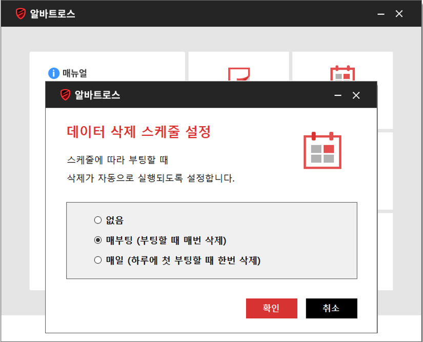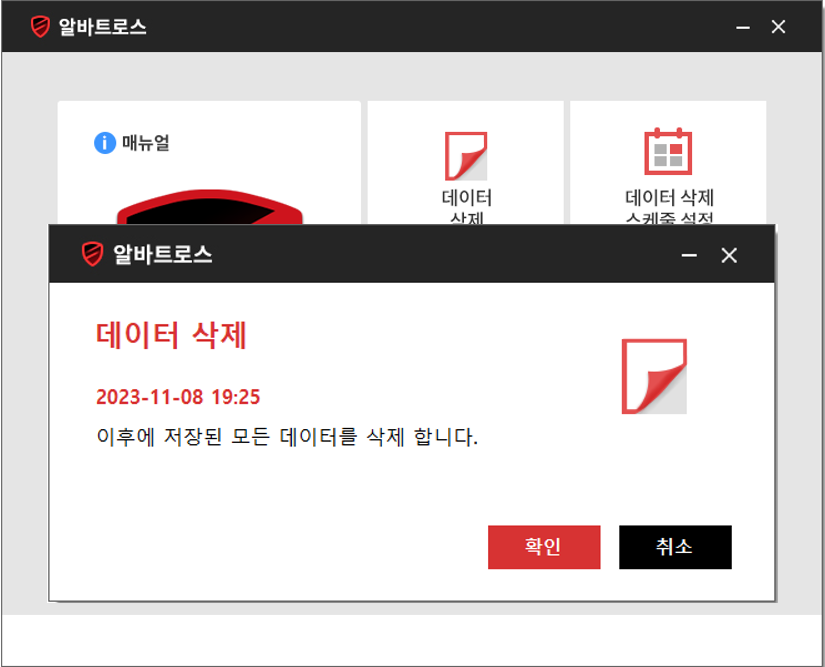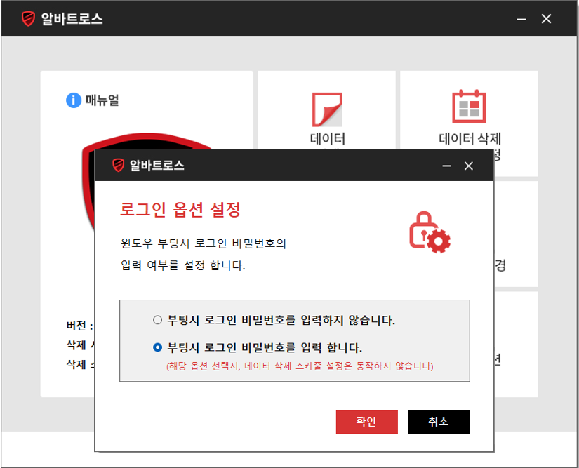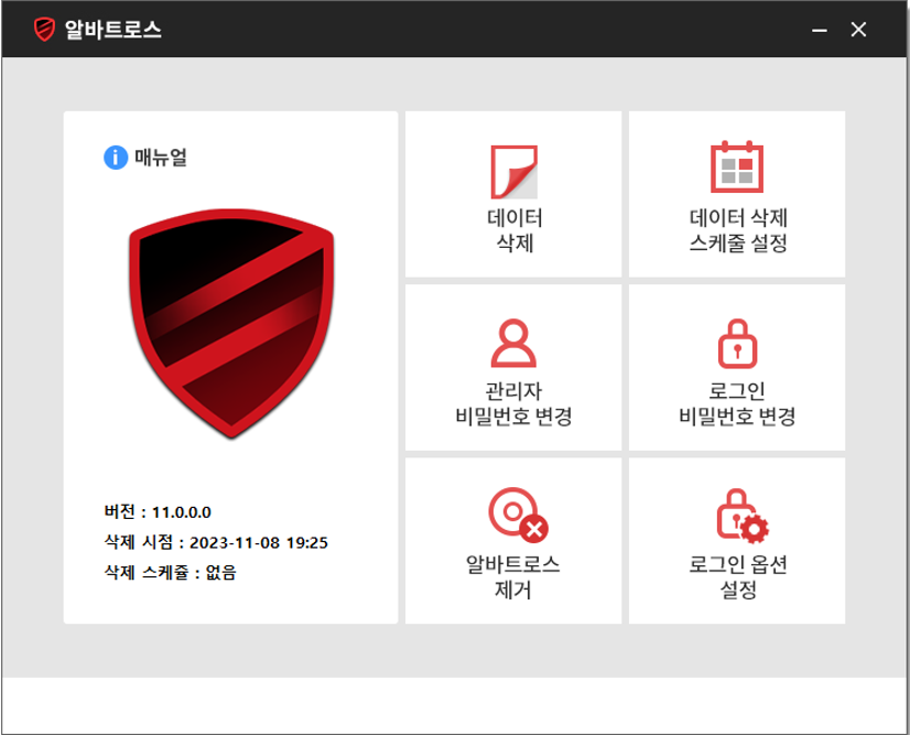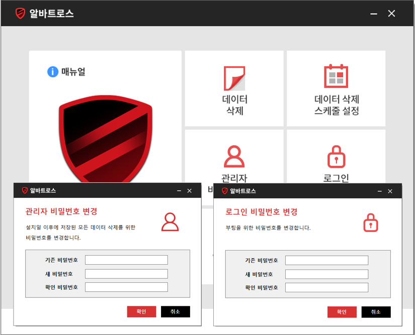 Alvbatros Main - 데이터 삭제 - 데이터 삭제 스케줄 설정 - 관리자 비밀번호 변경 - 로그인 비밀번호 변경 - 로그인 옵션 설정 - 알바트로스 제거 데이터 삭제 Albatros가 설치된 이후 저장되는 모든 행위, 데이터(암호화)들을 복구가 불가능 하도록 삭제하는 기능 (데이터에 연결된 Chain을 끊어 한 번에 삭제) 데이터 삭제 스케줄 설정 Albatros가 설치된 이후 저장되는 모든 행위, 데이터(암호화) 제거의 주기를 선택할 수 있는 창으로, *없음/매부팅/매일 세가지의 스케줄 설정이 가능 관리자, 로그인 비밀번호 변경 - 관리자 비밀번호 변경 : 저장된 모든 데이터 삭제를 위한 관리자 비밀번호를 변경 - 로그인 비밀번호 변경 : 부팅을 위한 로그인 비밀번호를 변경하는 기능 로그인 옵션 설정 Windows 부팅 시 변경한 로그인 비밀번호를 입력해야만 사용할 수 있도록 적용하는 기능 (비밀번호 입력 적용 시 데이터 삭제 스케줄 설정은 동작하지 않음)