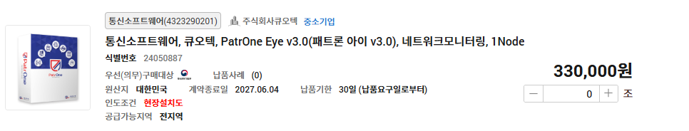 G2BSHOP 나라장터 종합쇼핑몰 >Maestro >PatrOne Eye >PatrOne Copy >PCGuard >nBlock >OfficeGuard SV >EdgeDB >I-Stamp Maestro PatrOne Eye PatrOne Copy PCGuard nBlock OfficeGuard SV EdgeDB I-Stamp 문의 전화 02.3663.3212 Daily:09:00~18:00 Lunch:12:00~13:00 PatrOne Eye Home > G2BSHOP PatrOne Eye v3.0(패트론 아이 v3.0)은 GS인증(1등급)을 획득한 제품으로 다양한 IT관리 자원을하나의 시스템에서 “통합 모니터링 하는 시스템” 입니다. PatrOne Eye v3.0은 보다 직관적이고 유연한 종합 상황판을 제공하여 장애 발생 및 성능 장애에 즉각 대응합니다. <아래의 품목을 각각 클릭하시면 조달청 디지털서비스몰로 바로 이동합니다.>
