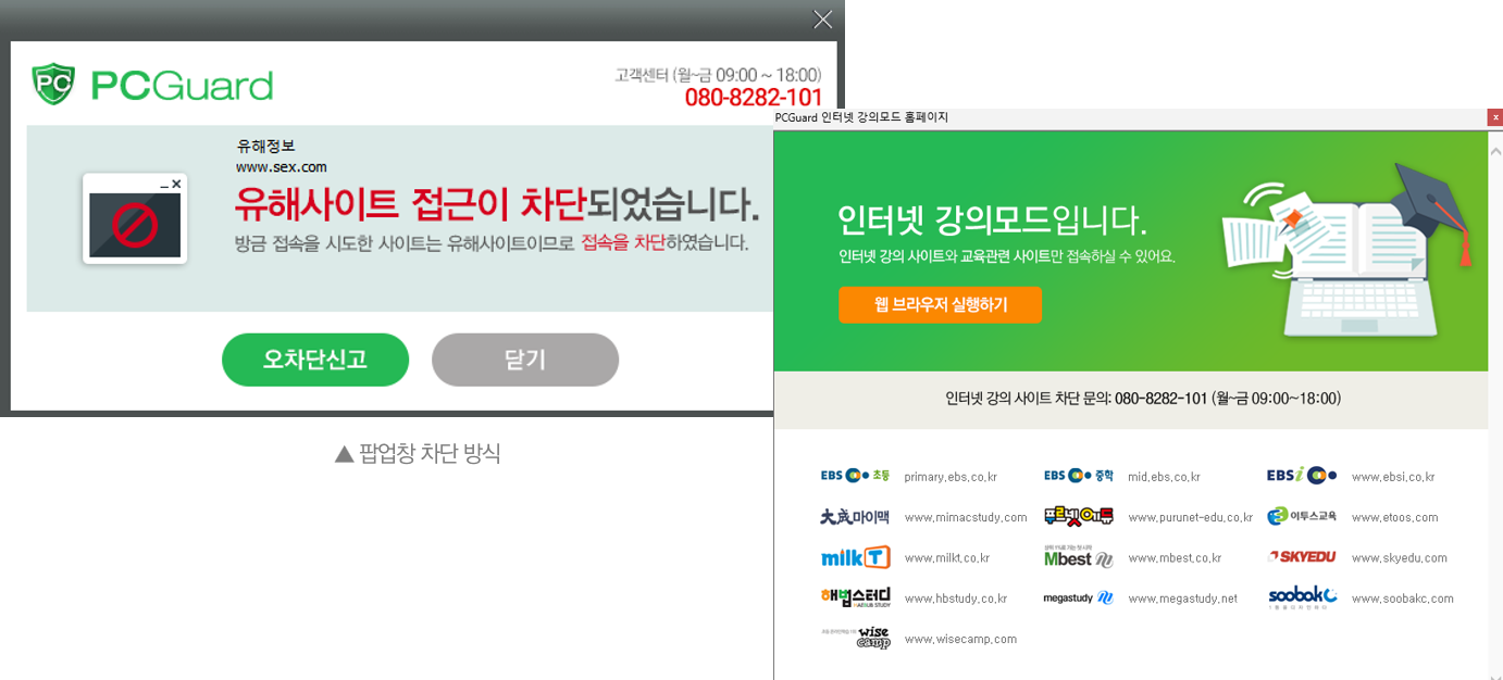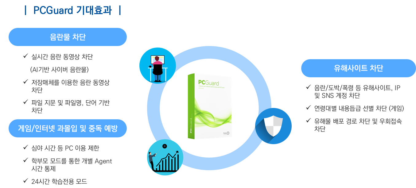유해 사이트 차단관리 ✓ 웹/응용 프로그램 접속 차단 및 통제 게임,앱플레이어,P2P,메신저 등 유해사이트 ✓ 우회접속프로그램 및 보안취약사이트 차단 UltraSurf,TOR,NordVPN,psiphone3차단 악성코드배포사이트 ✓ 사용자 정의 URL 사이트 추가 차단 유해사이트 외 교육과 관련 없는 사이트 차단 ✓ 음란동영상 차단 AI기반 실시간 음란동영상(유튜브) 차단 PC저장된 음란동영상 및 UCC 차단 정책관리 ✓ 차단 카테고리별 정책관리 기본 차단 카테고리(웹/응용프로그램등) 제공 세부 정책 관리 제공(차단/허용/업로드 차단) ✓ 적용 기간 및 일 이용 시간 관리 교육청 지정 정책적용 기간 및 시간 관리 기능제공 ✓ 백업/복원 관리 지원 정책의 일관성 및 지속적 관리 운용 지원 ✓ 부가 옵션 기능 제공 정책 적용 URL 조회 및 차단 테스트 기능 제공 모니터링 및 보고서 ✓ 사용기록 조회 PC이용시간,웹사이트/동영상/프로그램 차단 현황 그룹 전체 또는 학생 개별 조회 ✓ DB업데이트 1일1회 웹/응용프로그램 DB 자동 업데이트 DB 업데이트 이력 조회 ✓ 다양한 조건별 실시간 통계보고서 excel, hwp, csv, pdf, txt 형식 지원